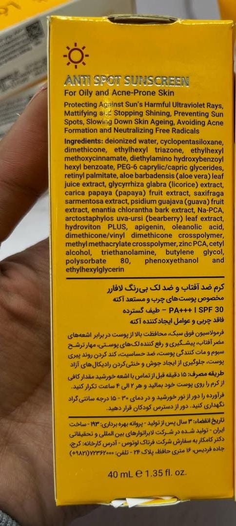 مشخصات اصلی کرم ضد آفتاب بی رنگ لافارر SPF30 پوست چرب:نوع: کرمکارایی: ضد آفتاب، ضد لکرنگ: نداردمناسب نوع پوست: چرب و آکنه دارمحافظت در برابر UVB :داردمحافظت در برابر UVA :داردحجم: 40 میلیلیترزمان استفاده: روزانهسن: بزرگسالانمناسب برای: خانمها و آقایاننواحی قابل استفاده: صورت بجز دور چشم دارای خاصیت: مرطوب کننده، ضد چروک، ضد لکعصاره: آلوئه ورا، خربزه درختی،شیرین بیان، گواوانوع محفظه نگهدارنده: تیوپیجنس محفظه نگهدارند: پلاستیکی سایر ویژگیهای محصول: بدون رنگ، بافت سبک، مات کننده پوست، خنثی کردن رادیکالهای آزاد، ضد حساسیت، شفاف کننده پوست ترکیبات: آب دیونیزه، اتیل هگزیل متوکسی سینامات، دای اتیلامینو هیدروکسی بنزویل هگزیل بنزوات، اتیل هگزیل تریازون، عصاره شیرین بیان، عصاره بیربری، عصاره saxifrage sarmentosa، عصاره پاپایا، عصاره گواوا، عصاره آلوئه ورا، اولینولیک اسید، Zn-PCA، آلانتوئین، Na-PCA، سدیم هیالورونات، اوره، گلیسیرین، سدیم لاکتات، پلی متیل متاکریلات، بوتیلن گلیکول، PEG-40، روغن کرچک، ستیل الکل، پلی سوربات-80، سیکلوپنتاسیلوکسان، دایمتیکون، ایزوتیازولینون
