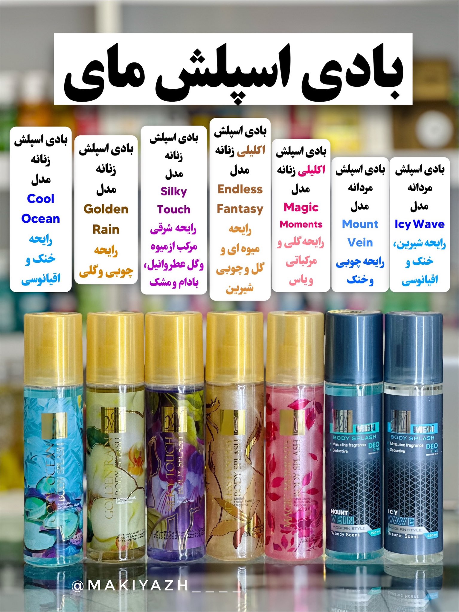 بادی اسپلش مای اورجینال حجم ۲۲۰ میل ماندگاری رایحه ۲۴ ساعته بدون آسیب به پوست حاوی آبرسان و گلیسیرین رایحه خوب و مناسب انواع پوست رایحه مردانه مونت وین :خنک و کمی تلخ/تازه و پر نشاط رایحه مردانه آیسی ویو:خنک و سرحال رایحه زنانه ابی: رایحه شیرین وکمی تلخ ر